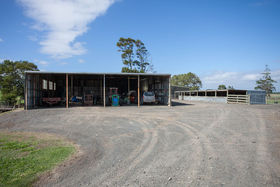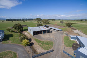Support buildings include a large 4 bay gable shed (20mx17m), a 6 bay gable calf rearing shed, a 3 bay gable high stud shed and two storage sheds.