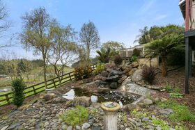 The generous balcony wraps around the living spaces, offering elevated views of the rolling country side, while the sun drenched deck is privately positioned, draped in lush greenery. The grounds are landscaped with low maintenance but striking plantings, an impressive waterfall and full post 'n' rail fencing of five paddocks. The property also offers a new barn with three stables.