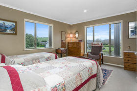 The home features four double bedrooms, one on the ground level, and three upstairs that all open out to a lovely private balcony, also sunny and facing the north. Two bathrooms with generous tiled showers, and a guest powder room on the ground floor, the double internal entrance garaging also houses the laundry area, and great storage. The huge 5131m2 (more or less) section features nice easy care gardens, boarding a neighbouring bush area and farmland at the back, vege boxes and big open lawns, plenty of room for the kids and pets, or build a shed and put in a tennis court or pool. Surrounded by other quality homes also on spacious sections, this home is where memories are made.