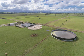The effluent system comprises a sump and stone trap and pumped (10hp pump) around the farm through underground plumbing (4 hydrants) with irrigation via a Williams travelling irrigator covering approximately 20 hectares. A steel holding tank 1600m3 (1.6m litres) is used when it is too wet to apply directly over the paddocks.