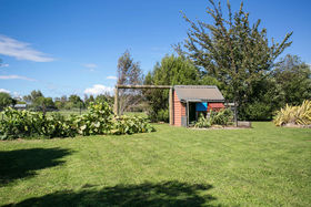 One paddock, currently grazing a horse, is well fenced along with the rest of the block. A doll's house is a fixture in one corner of the lawn.
